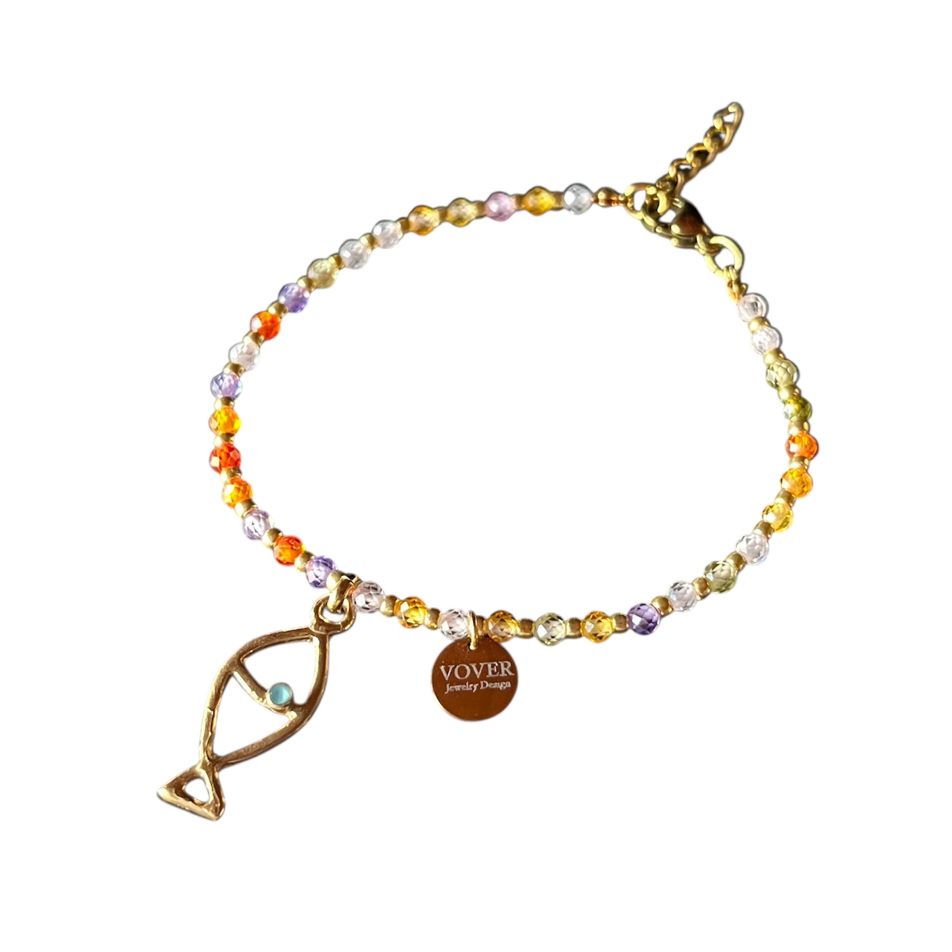Bracciali con pesciolino pendente in bronzo giallo fatto a mano. Bracciale di cristalli regolabile