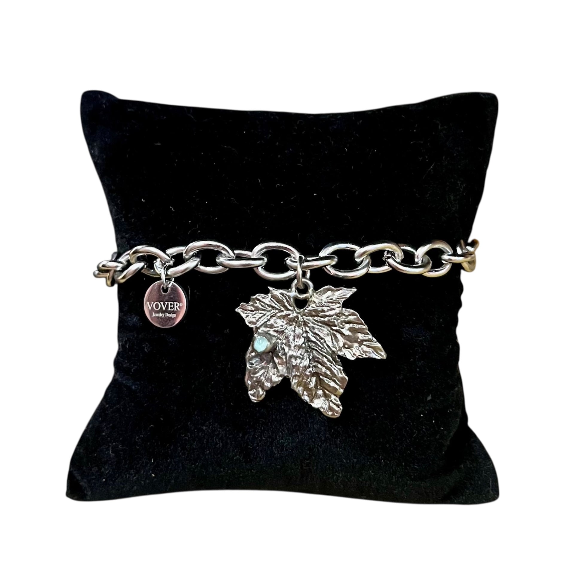 Catena in acciaio con ciondolo artigianale in bronzo bianco, ispirato alla foglia di vite, simbolo di rinascita e legame con la terra.