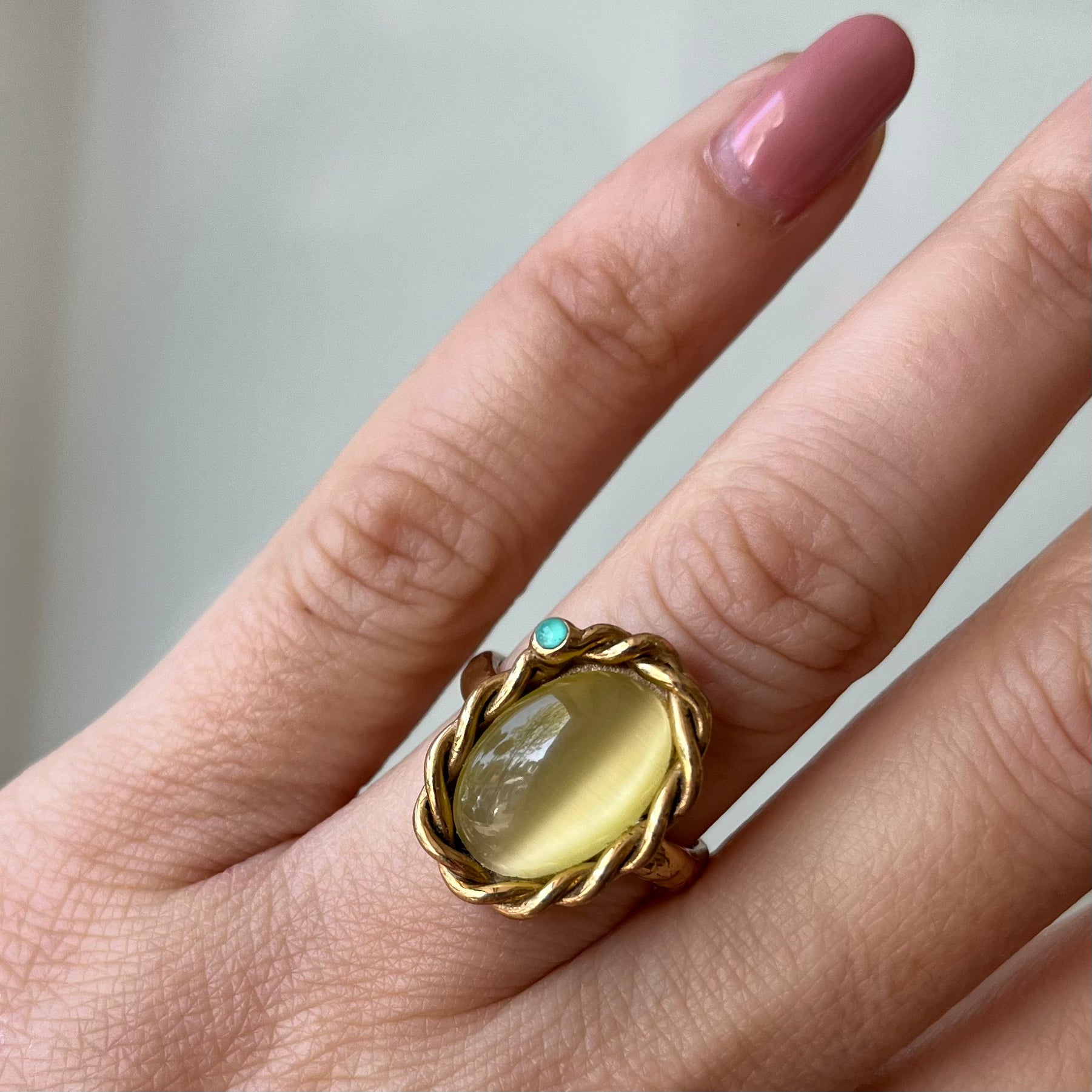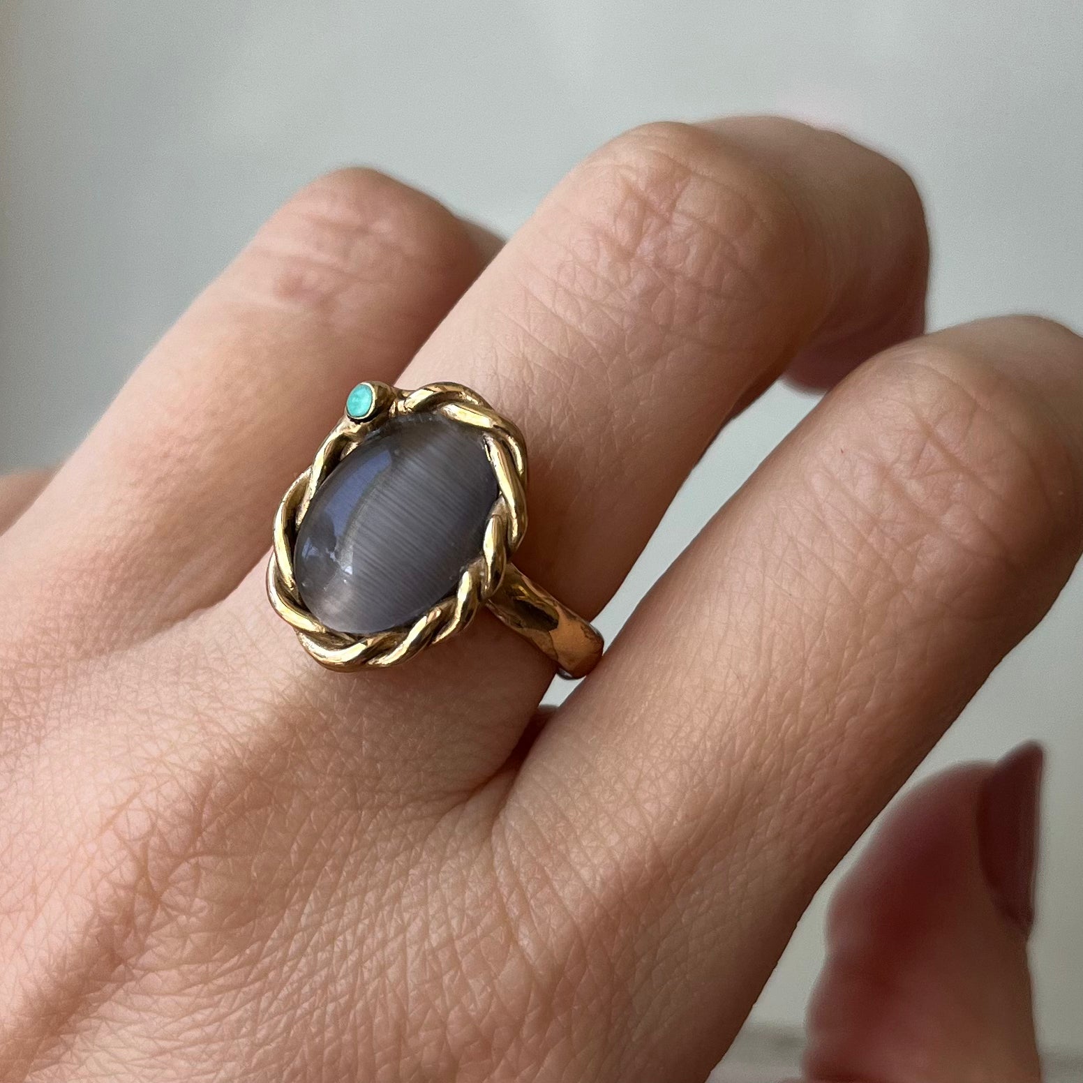 L'intreccio continuo avvolge la pietra colorata centrale, creando un'armonia perfetta sul dito.