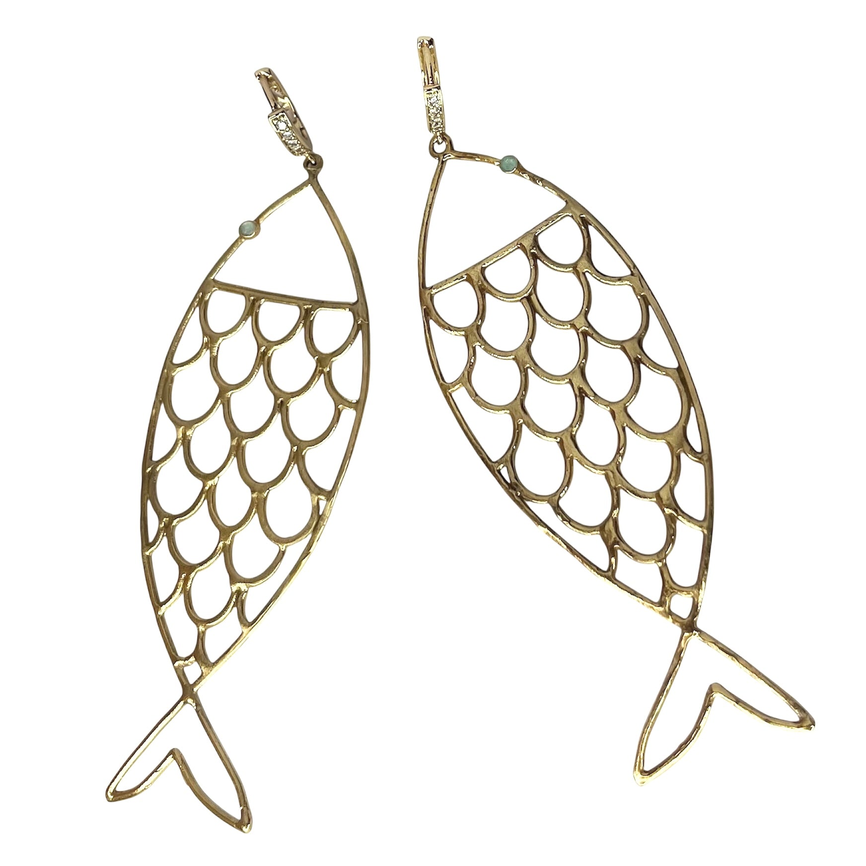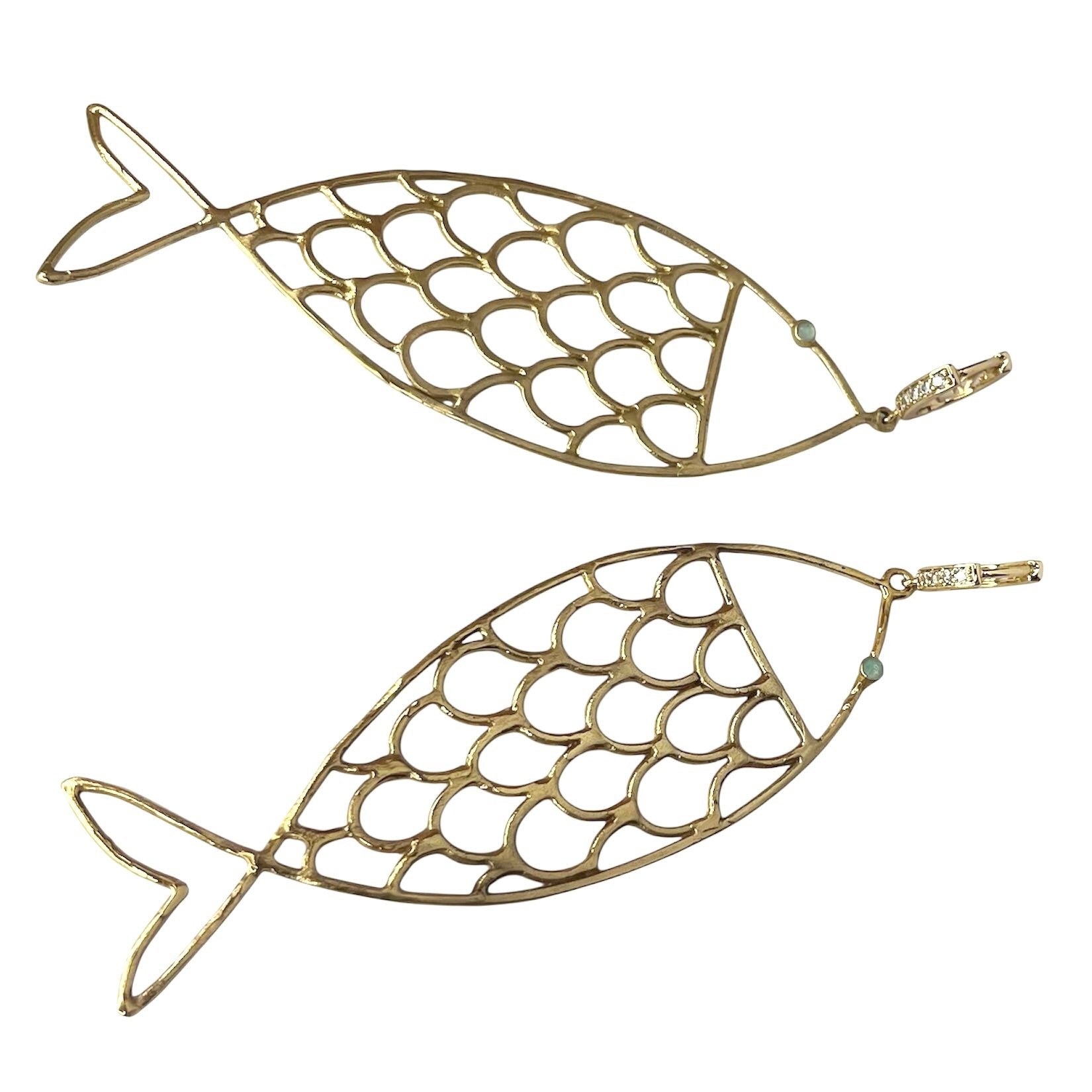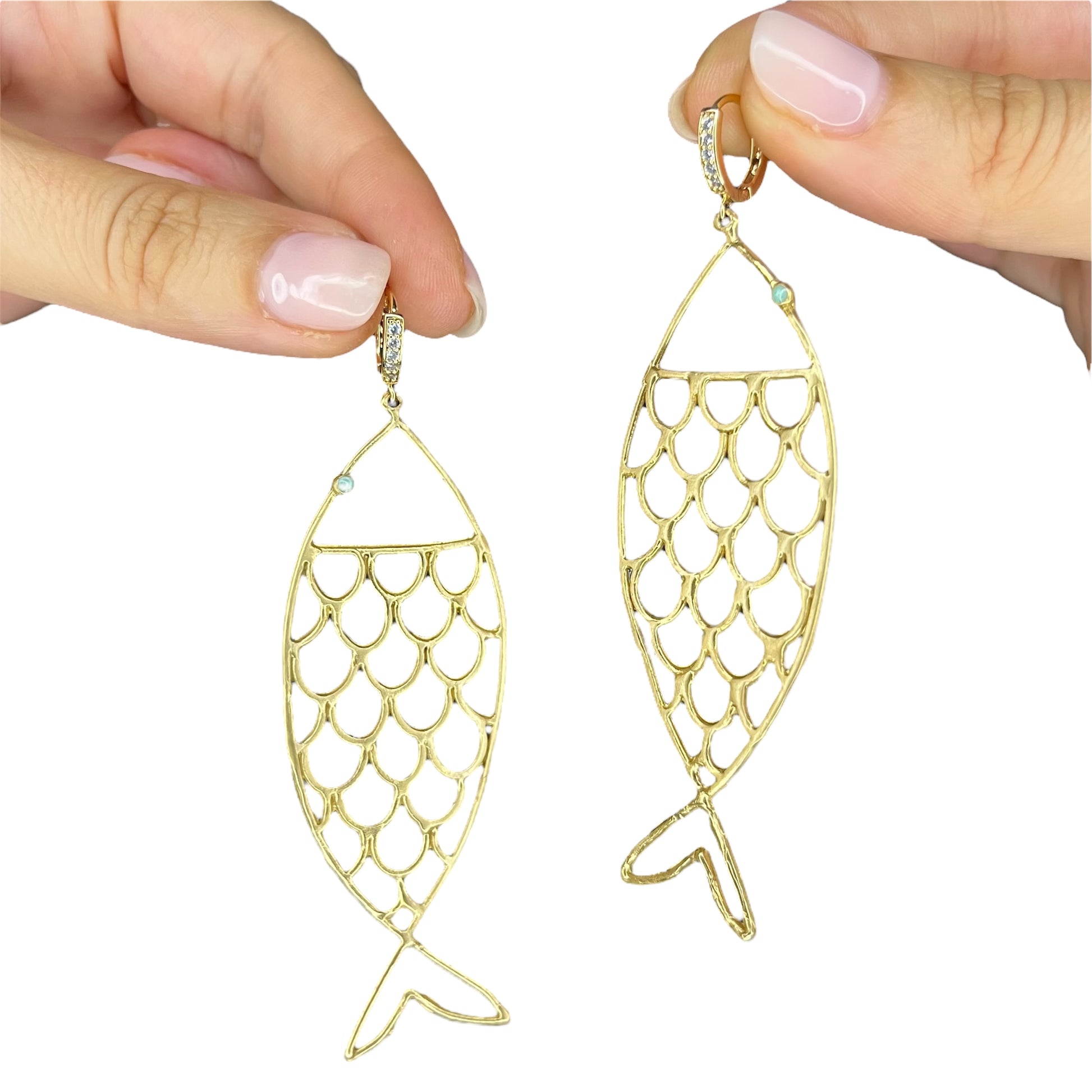 Un omaggio alla luce che attraversa le profondità marine, questi orecchini uniscono forza e delicatezza. Lunghi 9 cm e dal peso totale di circa 11 grammi, presentano un elegante pesce in bronzo giallo sospeso a un cerchietto in acciaio impreziosito da zirconi.