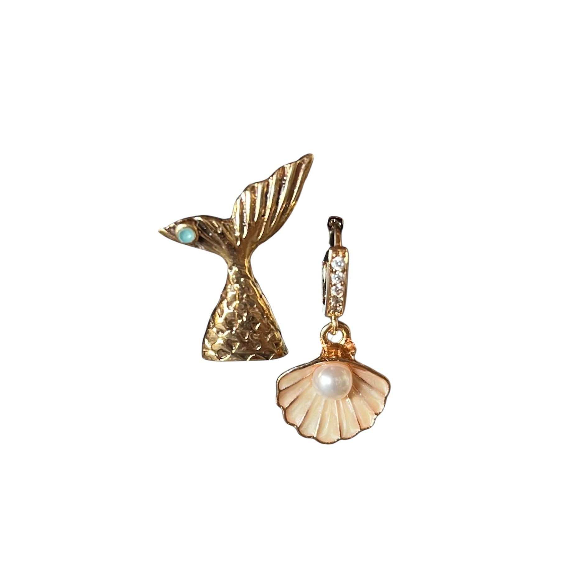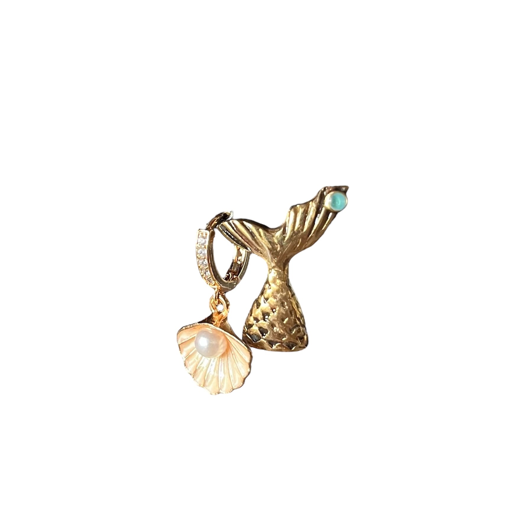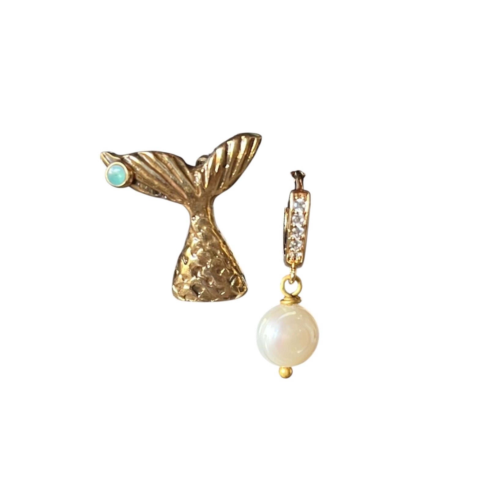 Un mix marino differente e originale: da un lato coda di sirena in bronzo con perno in argento, dall’altro cerchietto in acciaio con zirconi e pendente marino.
